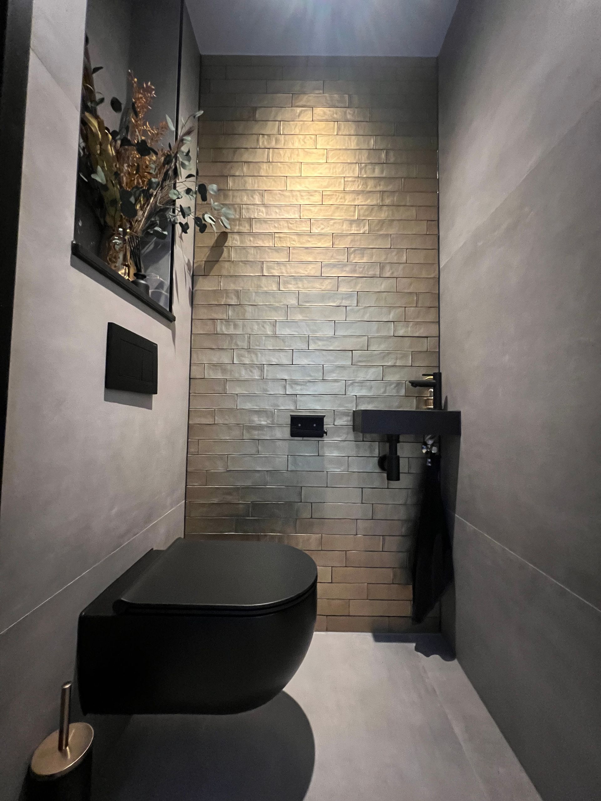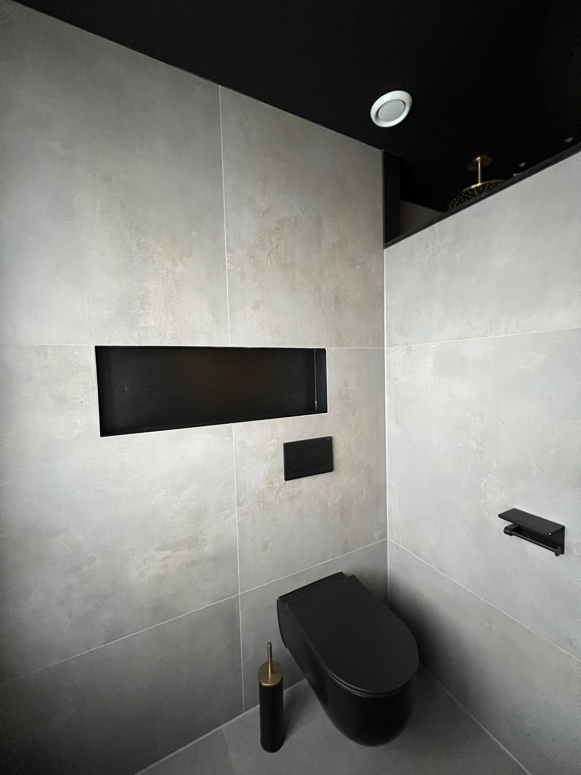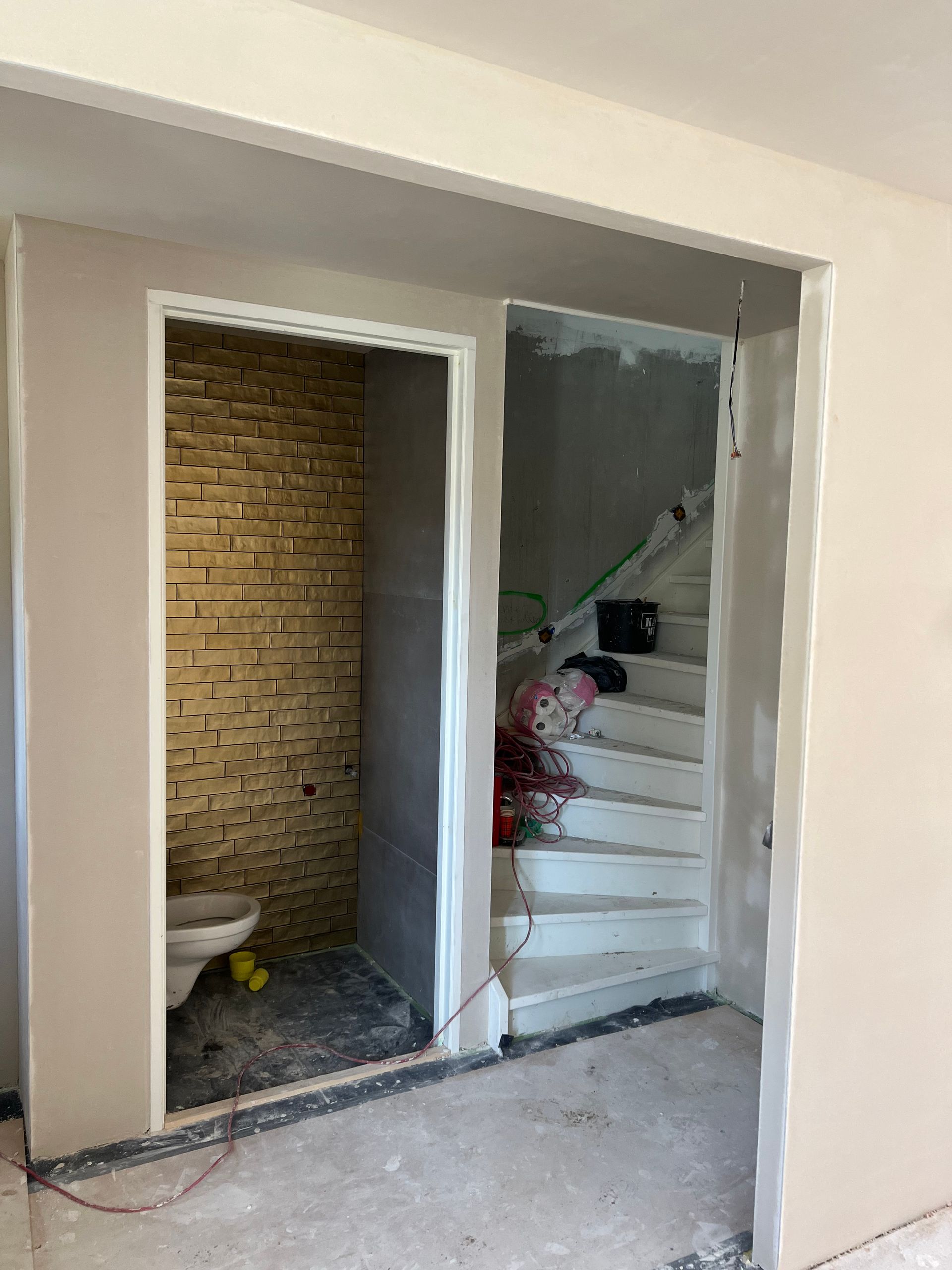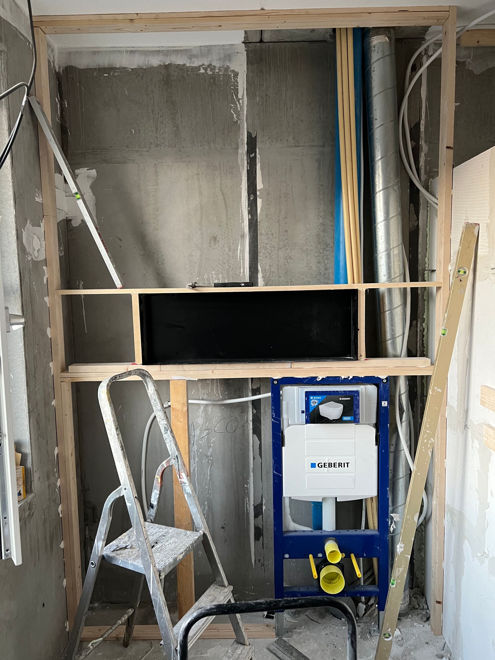 Van casco naar een WC met een grote nis. Wij hebben het wc frame geplaatst en vervolgens betimmerd met een nis. De nis is netjes afgewerkt met een composiet blad en het plafond is verlaagd en vervolgens gestukadoord.